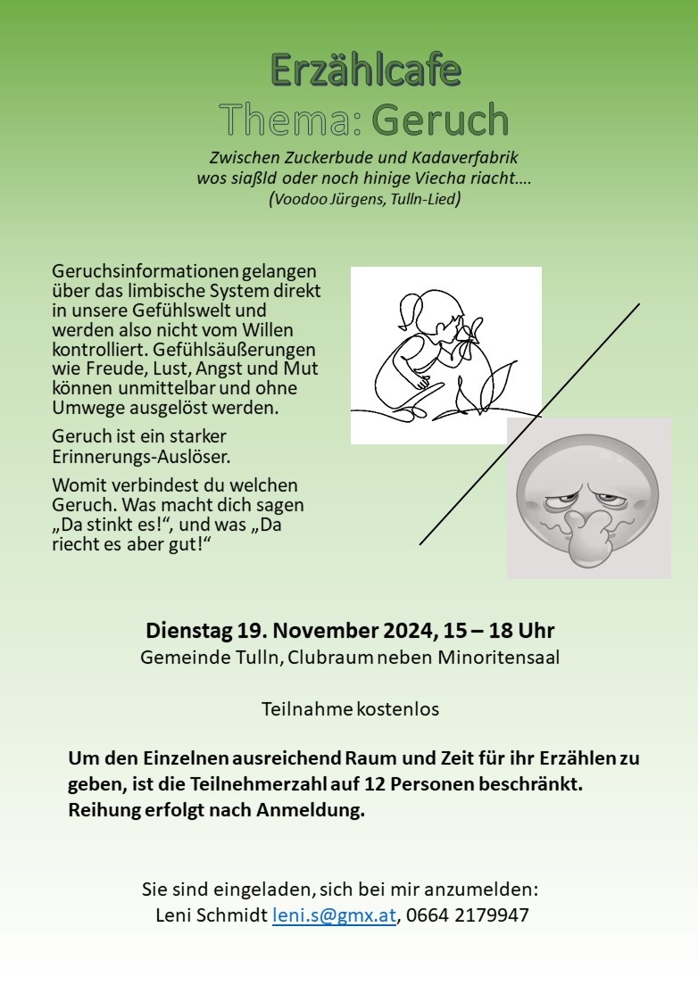 Erzählcafe: Thema: Geruch – Zwischen Zuckerbude und Kadaverfabrik, wos siaßld oder nach hinige Viecha riacht (Voodoo Jürgens, Tulln-Lied