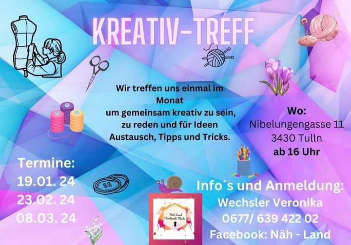 Veronika Wechsler hat im Sommer 2023 einen Kreativ-Treff ins Leben gerufen. Ein gemütlicher Austausch für Alt und Jung. Jede/r ist willkommen egal ob Profi oder AnfängerIn. Die Treffen finden 1x im Monat statt, um gemeinsam kreativ zu sein, zu reden und für Ideen, Austausch, Tipps und Tricks.