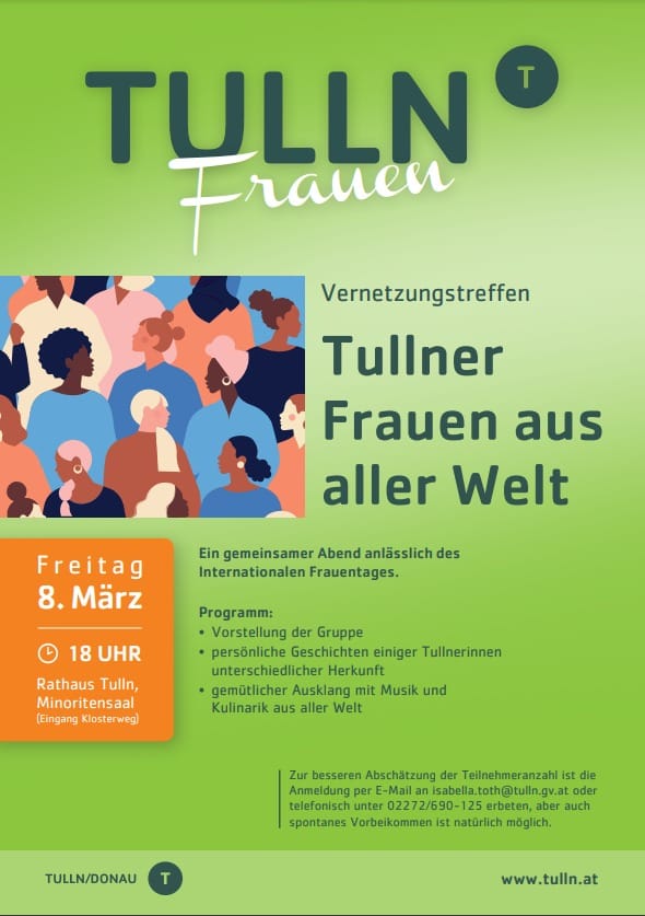 Die Stadtgemeinde Tulln und die bereits seit einigen Jahren bestehende Gruppe „Tullner Frauen aus aller Welt“ laden am Freitag, 8. März zu einem besonderen Abend ins Rathaus ein. Neben der Vorstellung der Gruppe und einiger persönlicher Geschichten der Tullnerinnen unterschiedlicher Herkunft steht der Austausch in gemütlicher Atmosphäre mit musikalischer Begleitung und kleinen Speisen aus aller Welt im Mittelpunkt.