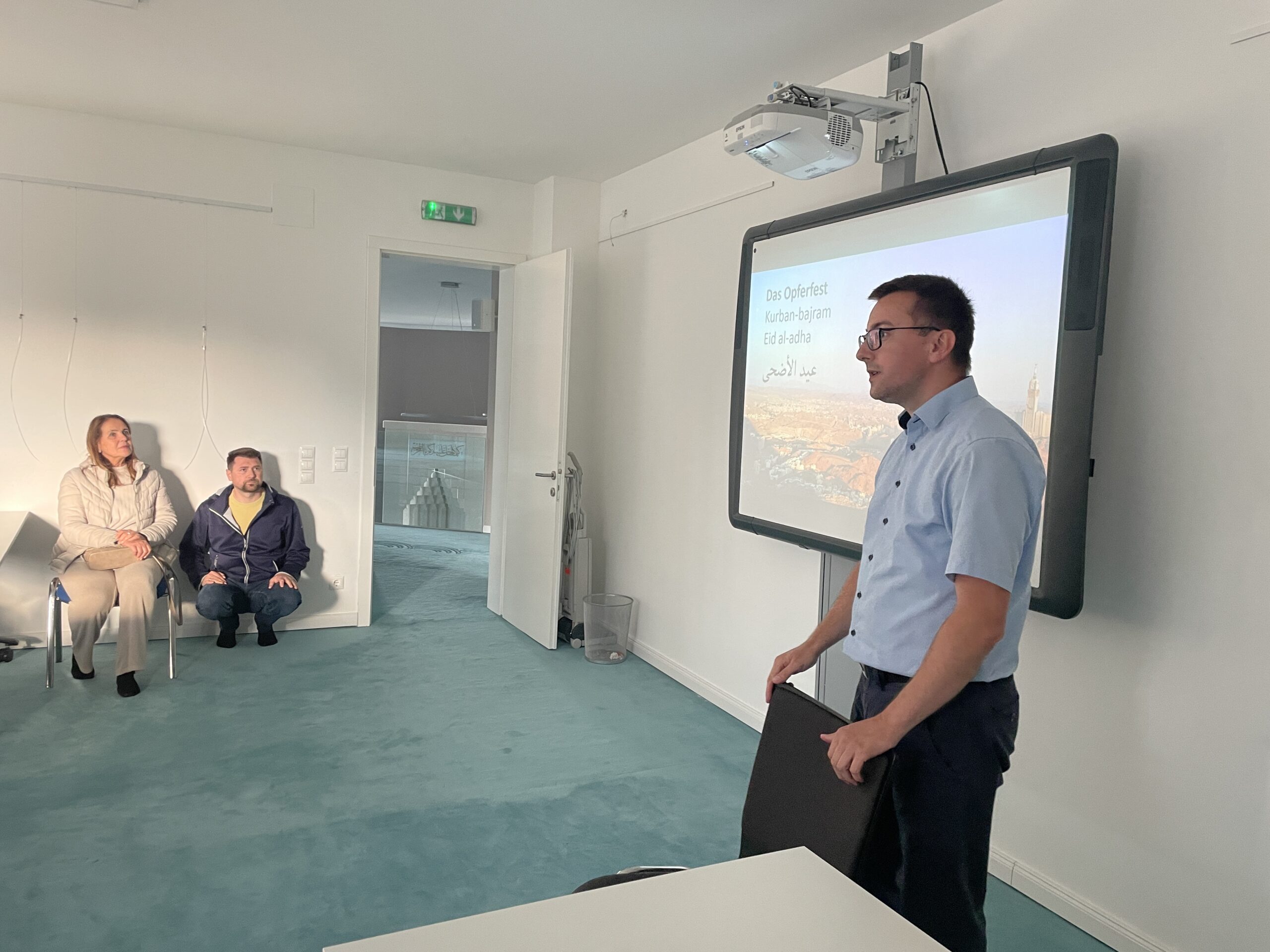 Bei der nächsten Station in der Moschee erklärte Imam Senad Kusur das Opferfest, welches eigentlich Pilgerfest heißen sollte. Dies deshalb, weil es im Rahmen der jährlichen Hatsch gefeiert wird und an das Opfer Abrahams erinnert. Er bringt Gott an Stelle seines Sohnes ein Opfertier dar, nachdem er zuvor von Gott geprüft wurde.