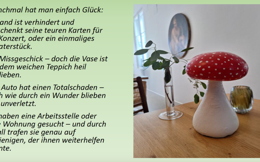 Manchmal hat man einfach Glück: Jemand ist verhindert und verschenkt seine teuren Karten für ein Konzert, oder ein einmaliges Theaterstück. Ein Missgeschick –doch die Vase ist auf dem weichen Teppich heil geblieben. Das Auto hat einen …