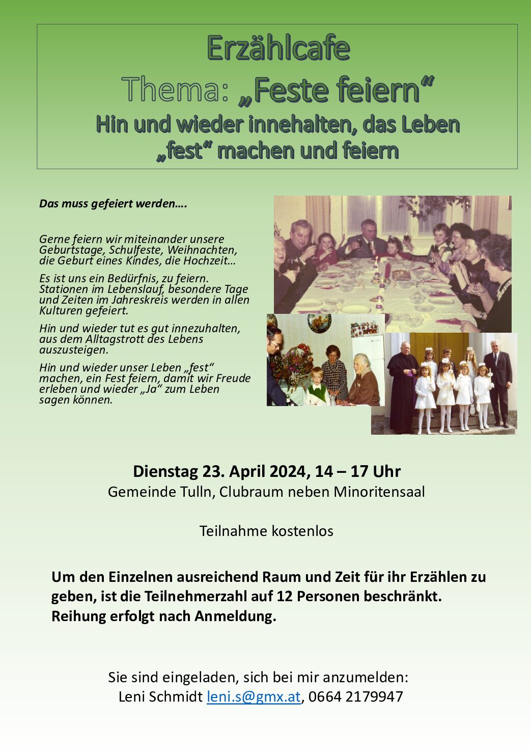 Das muss gefeiert werden… Gerne feiern wir miteinander unsere Geburtstage, Schulfeste, Weihnachten, die Geburt eines Kindes, die Hochzeit… Es ist uns ein Bedürfnis, zu feiern. Stationen im Lebenslauf, besondere Tage und Zeiten im Jahreskreis werden …
