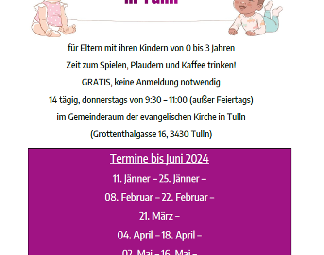 Beschreibung: Ein kostenloses Treffen für Familien mit kleinen Kindern zum austauschen und spielen! Keine Anmeldung notwendig! Ort: Tulln/Donau Lokalität: Grottenthalgasse 16 (Gemeinderaum der evangelischen Kirche) Info-Mail: constanze.stoekl@gmx.net