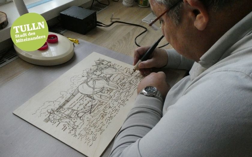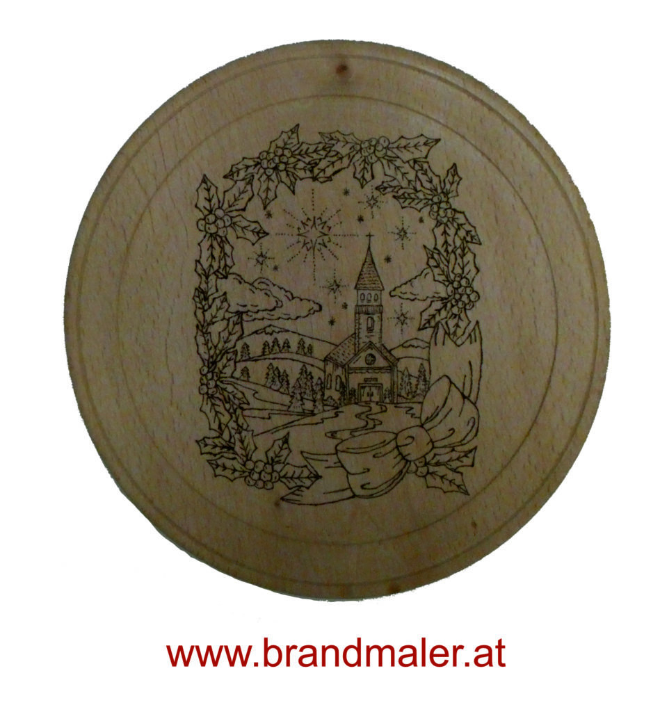 Die Brandmalerei ist ein uraltes Kunsthandwerk, das Franz Wallner leidenschaftlich betreibt. Es muss dabei sehr exakt zugehen, denn radieren ist nicht möglich. Mittels Brenngerät werden die Bilder auf Materialien wie Holz, Leder oder Kork gebrannt, teilweise auch koloriert. Für den Adventkalender hat Franz ein weihnachtliches Motiv dieser Kapelle für uns mitgebracht: