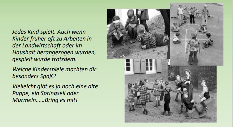 Jedes Kind spielt. Auch wenn Kinder früher oft zu Arbeiten in der Landwirtschaft oder im Haushalt herangezogen wurden, gespielt wurde trotzdem. Welche Kinderspiele machten dirbesonders Spaß? Vielleicht gibt es ja noch eine alte Puppe, ein …